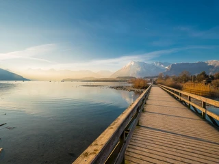 In winter, prepare to be entranced by a landscape glittering with ice and illuminated white by the snowy peaks of the Bernese Oberland. In summer, a soft breeze ruffles your hair as you saunter over the wooden footbridge. The bridge, set against a majestic background of mountains, is a much-loved photo opportunity. Come and see for yourself on a day trip to an oasis of relaxation. Rent a bicycle from Donkey Republic in Thun or stroll from the centre of town to the park via the banks of the lake.