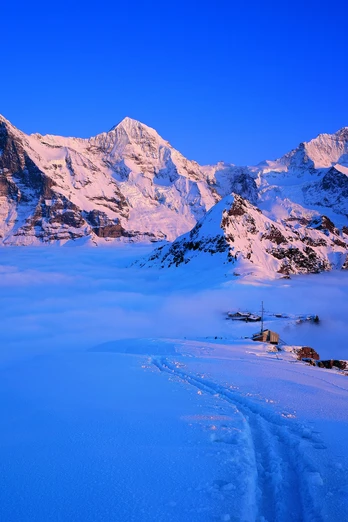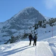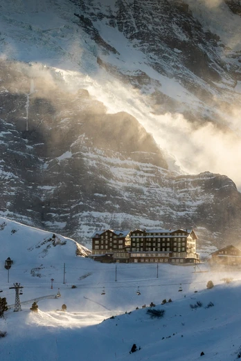 No very early start is necessary for this winter hike: because of the sunshine, you should only set out from Männlichen around 11 a.m. in December and January. You leave its gondola station heading south-southeast with a view of the impressive north face of the Eiger, the Mönch, and the Jungfrau. Unlike in summer, the trail leads downhill along the slope in the cold season, sometimes quite steeply. You have to cross several ski slopes and at the same time keep an eye on the trail markings. Depending on the snow conditions, a somewhat tricky slope is encountered towards the end of the ski area. Poles can be helpful when crossing the slope here. Then follows the quietest section. Suddenly, an old larch forest appears that invites you to dream and take a break. Then you enter the next ski area at Bustiglen. Here the preliminary lowest point of the hike is reached. Now the winter trail steadily climbs up to Kleine Scheidegg with the impressive Hotel Bellevue des Alpes, a grand hotel with historic furnishings. The trio of peaks Eiger, Mönch, and Jungfrau seem within reach here. From now on, the winter trail gently descends southwest. Now mutual consideration is even more important because the trail is shared with sledders. Occasionally, families on skis can also be encountered. However, due to the gentle gradient, no one moves fast enough to cause collisions. After just over two and a half hours, you reach Wengernalp. On the sunny terrace of the Hotel Jungfrau Wengernalp, you can enjoy your time until the departure of the Wengernalp Railway.