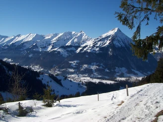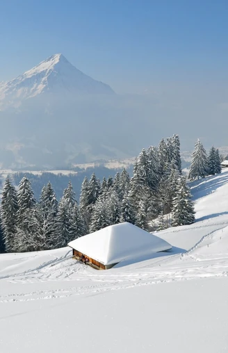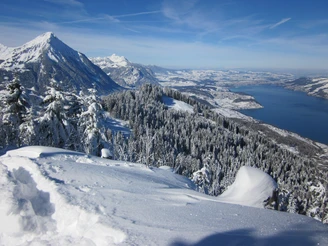 The signposted snowshoe route leaves the district of Aeschiried in a wide arc and gently ascends. Over snow-covered alpine meadows, the route climbs to Aeschiallmi. Around the ski lift and the famous ski hut, you will meet other winter sports enthusiasts. Already here a wonderful view opens up to the Kandertal. To comfortably gain altitude in the somewhat steeper terrain, the route follows the snow-covered summer track up to the Alp Bireberg. At the alpine hut, the path is left, and it climbs over open terrain to the ridge. The route now follows the ridge steadily ascending via the Greberegg to the foot of the Morgenberghorn. The Greberegg invites to rest and offers a fantastic view both of the Thun and Brienz Lakes as well as the Kandertal below. Then a last steep ascent awaits that takes you to Alp Brunni with the stately Brunnihütte (unmanned). During a long rest at the foot of the Morgenberghorn, enjoy the great panorama. The return to Aeschiried follows the same route.