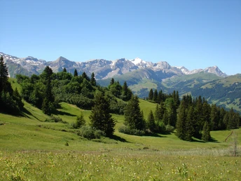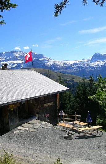 The bus runs from Lenk station up to Bühlberg. From there, the high-altitude hike leads along the west flank of the Lavey ridge, past the reforestation area between Lavey and Obere Seewele, towards Schatthore. In the morning, it is still shady on the west flank of the Lavey ridge. The higher the sun rises, the more its warmth can be felt on your back. If the Obere Seewele alp is operated, a tasty piece of alpine cheese can be bought. Over a ridge you reach the summit of Schatthore, which actually resembles more a long mountain ridge than a 'Hore'. Nevertheless, the view over the Lenk and its side valleys is wonderful. Paragliders can often be seen here, circling high above the heads of the hikers. For the descent, a portion of the path already covered must be retraced to the fork in the path. In a forest clearing lies, like on a arbor, hence the name Laubbärgli, a mountain hut. The charming little wooden house with its red-white checkered tablecloths invites you for a snack. The return to the Lenk is by a small bus directly from Laubbärgli.