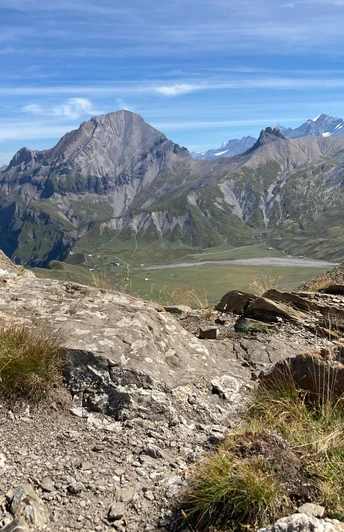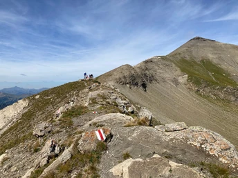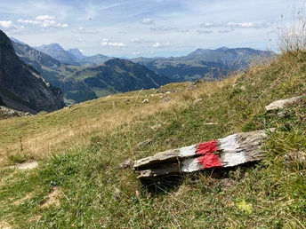 From the cable car mountain station, the wide high plateau of the Engstligenalp is crossed in a westerly direction past the Läger. Then the path begins to rise – first gently, then increasingly until it finally overcomes the barren grassy slopes on the Ammerte ridge in steep switchbacks. At the top of the pass height, a fantastic panorama awaits: Looking back you can see the mighty Lohner group and the wildly jagged Tschingellochtighore above the Engstligenalp, ahead is the upper part of the Simmental: The narrow Ammertetal stretches between the Ammertespitz and the foothills of the Wildstrubel, in between in the background rises the grass- and forest-covered flank of Oberlaubhorn. Before the descent, follow the wide ridge for a few minutes; then it goes very steeply down on crumbly shale ground. When wet or snowy this surface is very slippery and offers little hold; therefore, the hike should only be done in dry weather. From the area of the Ammerte-Schafberg, the path runs less steeply, first on grass, then on gravel and stable rock slabs. Shortly after reaching the tree line it branches off to the right, leading with a slight ascent to Ammerte and from there down to Stalde. Very close is the Barbara bridge with the roaring waterfalls of the Simme. Along the river, you reach the destination, Lenk railway station, across the wide valley floor via Rotebach and past the course and sports center (Kuspo).