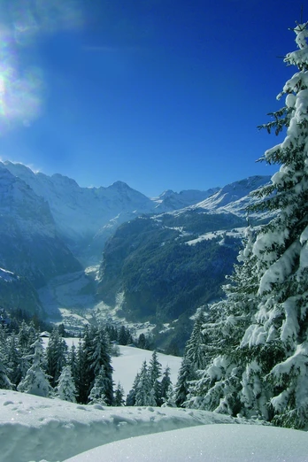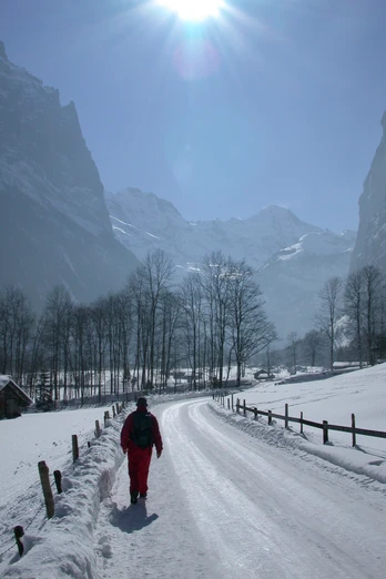 Vom Bahnhof Lauterbrunnen geht es zunächst der Dorfstrasse entlang zum Hotel Schützen. Der Staubbach ist im Winter nur ein dünnes Rinnsal, das sogleich zu einem kaum sichtbaren Hauch zerstiebt. Dennoch führt das stete Fliessen in sehr kalten Nächten zu bezaubernden, gewaltig grossen Eiszapfen-Formationen. Unter der Einwirkung der Sonne stürzen diese tagsüber mit eindrücklichem Donnern in die Tiefe. Grosshorn, Breithorn und Mittaghorn bilden im Talhintergrund eine majestätische Kulisse. Der Weg führt über ein verkehrsarmes Strässchen immer südlich und geradeaus weiter, vorbei an der Abzweigung «Bir Buechen», zur Stägmatta. Hier geht die Route erneut in einen Fussweg über, der durch lichten Auenwald entlang der Lütschine an den Häusern von Lengwald und Matta vorüber zum Zielpunkt Stechelberg führt.