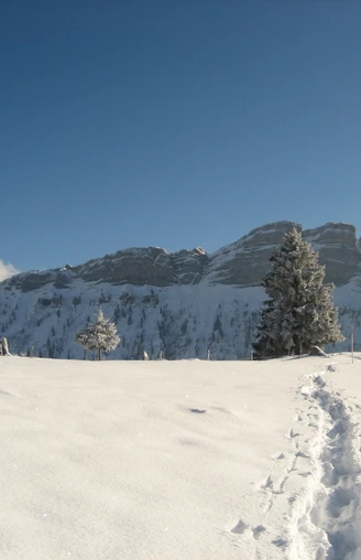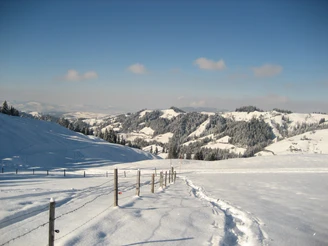 The Eriz Trail starts in the district of Rüttegg near the Eriz/Linden bus stop. From Rüttegg, the snowshoe route rises gently, passing the Alp Vorderezugschwand to the first height. Wonderful views open again and again into the Zulgtal and far out into the Mittelland. Through a small wooded section, you reach the Alp Vordere Schöriz. Then the path steadily climbs to Stouffeli. The idyllic hut below the Stouffe ridge offers a wonderful wide view and invites you to linger.