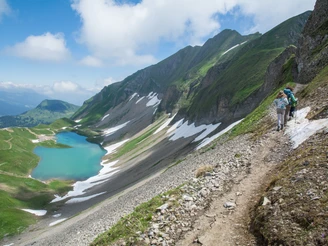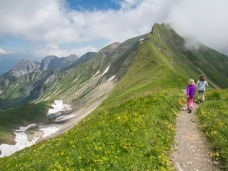 Wenige Meter unterhalb des Gipfels zweigt der Wegzum Eiseesattel ab, den wir durch den Abstieg über die Ostflanke des Brienzer Rothorns oberhalb des gleichnamigen Sees erreichen. Es folgt der einzige nennenswerte Anstieg der Tour. Bereits nach wenigen Minuten wird der Weg ausgesetzter, die exponierteste Stelle ist mit einem Drahtseil gesichert. Kurz darauf erreichen wir den Grat. Entlang einer üppigen Flora geht es auf einem abwechslungsreichen Gratabschnitt hinauf bis zum Gipfel des Arnihaaggen. Durch dessen grasige Südflanke steigen wir etwas ab und wandern danach auf dem Grat bis zum Gipfelaufbau der Höch Gumme. Der Berg wird auf konstanter Höhe über die Südflanke umgangen. In den zu querenden Rinnen kann bis in den Sommer hinein noch Schnee liegen, so dass hier erhöhte Vorsicht geboten ist. Ab der Wegkreuzung Gibel bei P.2039 sind die ausgesetzten Passagen gemeistert. In Kürze erreichen wir das Berghaus Schönbüel, eine nette Gelegenheit für eine Einkehr.