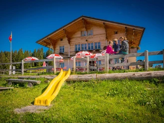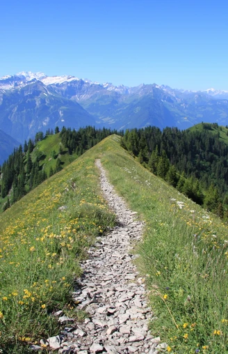 At the start of the hike at Lombachalp-Roteschwand bus stop, follow the sign for the Augstmatthorn. A path runs over grassland up to point 2101 and then to the Augstmatthorn a little further along. There are several difficult sections to overcome, however the panoramic view more than makes up for the effort. To the north, the view sweeps from the moors of Lombachalp and the source of the River Emme to the Hohgant and the Schrattenfluh. On a clear day you can even see the Jura mountains. To the east, you can make out the top of Lake Brienz and the Aare plain. The rim of the Bernese Alps can be seen spanning from the south to the west. If you’re lucky, you’ll also see a herd of ibex, proud animals that will let you watch up to just a few metres away. The next section of the hike runs a little below or over the narrow arête. This offers even more intoxicating views on the one hand, but longer exposed sections, as well as portions that are difficult to negotiate on the other. Surefootedness and a head for heights are essential. This means walking while focusing all of your attention on the path in front of you and stopping if you want to take in the view. The trickiest sections are equipped with a rope. After Suggiture, the descent takes you down below the tree line, where it continues along a varied route through meadow or woodland towards Harder. At Wannichnubel, you can take a short detour to the “Chnubel” for the view over Lake Thun. The same view can be enjoyed from the platform at Restaurant Harderkulm. An information panel will help you identify the peaks. A short distance further along you reach your destination, the summit station of the Harder Kulm funicular railway.