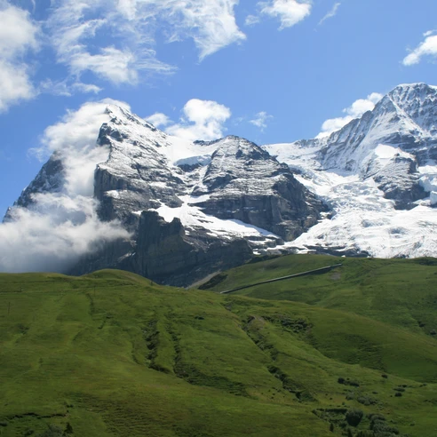 From the starting point of the hike, the Eigergletscher stop, follow the signposted destination, Wengen. The view stretches from the Schilthorn over the peaks along Lake Thun and Lake Brienz to the Grosse Scheidegg. On a path marked as a mountain hiking trail, later an alpine path, you descend to Kleine Scheidegg. Here you can enjoy the view for the last time of Grindelwald, the Faulhorn, Schwarzhorn, or the Grosse Scheidegg. Travelers heading to Jungfraujoch must change from the Wengernalpbahn to the Jungfraubahn at Kleine Scheidegg. Accordingly, the place is busy here. The railway line, opened in 1912, has become the engine of tourism, as the Jungfrau Region label shows. The route is now marked as a hiking trail and as Via Alpina 1 by Wanderland Switzerland. Diverging to the left, you continue descending past alpine pastures to the Wengernalp and then to a viewpoint with benches. From here, the village of Wengen and in the background the Gemmenalphorn and the Seefeld karst area can be seen. A panel explains the World Cup Lauberhorn ski downhill race. The view of the section with the well-known parts Hundschopf, Kernen-S, or Wasserstation is impressive. The hike continues on a service road above or then through the Baan forest. Leaving the forest at Allmend, the view of Wengen opens again. We recommend occasionally stopping and looking at the Jungfrau. Eiger and Mönch are not visible; they hide behind the Lauberhorn. Soon, the hike's destination, Wengen station, is reached.