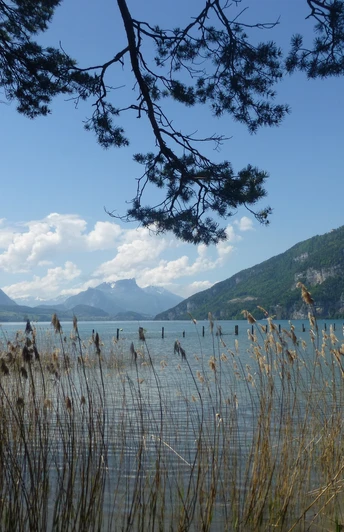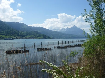 On the right you can see the ruins of Weissenau. The castle was built in the 13th century to control goods traffic. It was abandoned in the 16th century and then fell into ruin. Shortly afterwards, at a parking lot in Weissenau, the path turns left and leads into the Weissenau nature reserve. Several spots allow nature enthusiasts to observe birdlife. The path runs close to the shore, with an unobstructed view of Lake Thun and the surrounding mountains. Soon the beach at Neuhaus is reached. Over the parking lot and through an underpass, you reach the Lombach bridge and the Lombach promenade. The sign here indicates Unterseen. The sound of the stream accompanies hikers for the next two kilometers to St. Niklausen. At the bus stop with the same name, continue on foot at the foot of the Harder towards Interlaken East. Only after passing the cemetery does the path turn towards Interlaken West and skirts Untersee. This once strategically important place burned down twice in its history and was granted city rights as early as the 12th century. In short, the destination is reached at Interlaken West station.