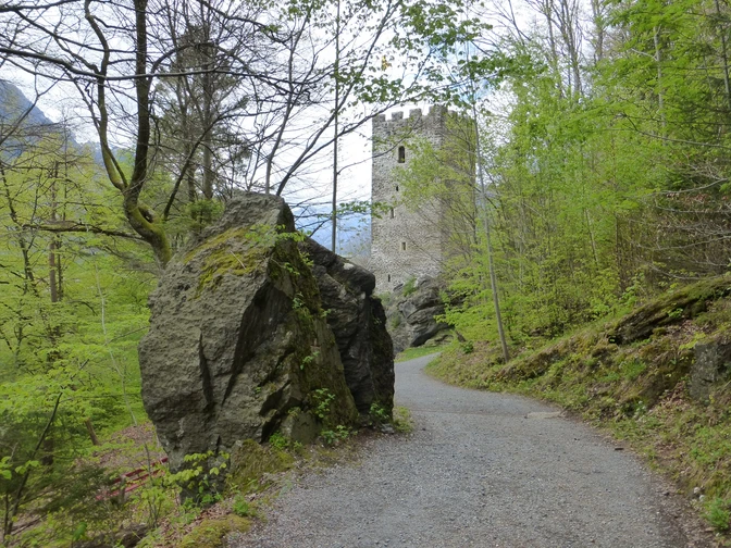 Am Ausgangsort der Wanderung beim Bahnhof Meiringen ist die Wegweiserrichtung Hasliberg / Hohfluh in die Amtshausgasse einzuschlagen. Ab dem Wegweiserstandort Meiringen Amtshaus folgt man der Angabe Schrändli Bärenwägli. Auf einem steilen Pfad, als Bergwanderweg markiert, erfolgt der Aufstieg durch den Wald und ein kurzes Stück auf Fahrweg über Weiden vorbei am Alpbachfall zum Schrändli. Hier lädt der Skulpturengarten zu einem Besuch ein. Weiter verläuft die Route auf einer Fahrstrasse aufwärts in Richtung Hasliberg – Reuti. Beim nächsten Wegweiser folgt man dem Wanderweg nach Mühlefluh Reuti. Wenig später wird der Milibach über- und die Luftseilbahn Meiringen – Hasliberg unterquert. Durch den Wald steigt der Fussweg zur Mühlefluh Punkt 975 auf, dem höchsten Punkt der Wanderung. Hier wird der Blick auf Meiringen und die Brienzerrothornkette frei. Nun schliesst sich der Abstieg, wiederum meistens durch Wald und Weiden über Wylerli in den Talboden an. Es folgt ein kurzer Aufstieg, mit dem ein längerer Abschnitt auf Hartbelag umgangen werden kann. Überraschend taucht der Restiturm auf, der einzige erhaltene Teil der Burgruine Resti aus dem 13. Jahrhundert Sie diente einst dem Schutz der Verkehrswege in der Talebene und zu den Pässen Grimsel, Joch und Susten. Den Wegweiserangaben Meiringen Bahnhof folgend, gelangt man an der sehenswerten, kunstgeschichtlich interessanten Sankt Michaelskirche vorbei ans Ziel der Wanderung.