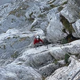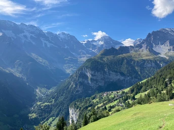 Through the unlit (and unmarked) tunnel to the south side of the tennis courts (overview board), then along the east side of the tennis court wall. From there, descent and traverses in the stepped terrain of the Mürrenfluh, alternating between rock and soil sections. Exposure increases, and soon the first key point is reached: the passage about 600 meters vertically above the Lauterbrunnen Valley with cable car station and parking lot – here there are really just metal rungs and lots of air under your feet. Then it continues, at times on limestone and at times in forest, along the Mürrenfluh. A short vertical ladder provides variety, as does the rather shaky three-wire bridge over the Mürrenbach. It is also crossed by the 60-meter-long zip line, which can only be done accompanied by mountain guides (sign "closed", so choose the right branch at the fork). Before and after the Sinterbach there are several ladder passages, some vertical, though exposure is small. A short three-wire bridge over a ditch offers more variety. At about 1300 meters, the lowest point of the via ferrata is reached. Soon after comes the finale: the 80-meter-long hanging bridge, which is very shaky and has no continuous rope to hold on properly. The safety rope you clip into is movable and fixed only every fourth suspension point; at least you can hold on to the supporting cable in the middle of the bridge... However, the hanging bridge can be avoided by exiting to the path between Mürren and Gimmelwald. After the hanging bridge, the Mürren via ferrata ends, only a short ascent remains to the overview board with route book and the cable car station Gimmelwald (1363 m, 3 hrs).