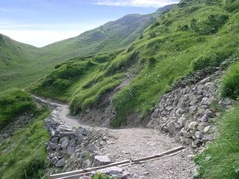 From the village square in Blumenstein, first a few steps along the main road into the valley. Then turn towards the hillside and up to the magnificent farmhouses in Wäsemli. Always off the road, you soon reach the Bluemisteichilche with significant stained glass windows from the Upper Rhine school (14th century), frescoes, and beautiful wood carvings. Church, tithe barn, and former parsonage form one of the most beautiful building groups in the Canton of Bern. Slightly above the church over the Fallbach and, continuously steeply rising, up to point 983 in the Möntschelenwald. On a narrow forest path, go up through the steep mountain forest to Alpetli. The old Zügelweg (“zügle” = to change) overcomes the steep slope of the Chrümmelwäge with many switchbacks. Cross the south flank of the Walalp ridge, down an alpine path to the Oberi Walalp mountain hut and then steeply up again into the pronounced saddle Baachegg. Over rocky steps, head directly towards the Stockhorn face and reach the shoulder of the horn at its foot edge. Passing the cable car station with panoramic restaurant, follow the signposted flower teaching trail up to the Stockhorn summit. The panoramic view over the Mittelland, the Jura, and the entire ring of mountain giants is unique.