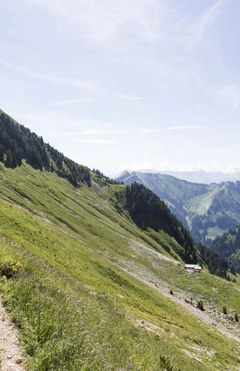 Now the actual high-altitude trail begins on the almost continuously steeply falling southern slope of the Stockhorn-Gantrisch ridge. With slight ups and downs across meadows and through short forest sections, finally passing through a rocky, boulder-lined gorge, you reach the terrace of the Alp Chuelouenen via Stierenhütte and Äust. The path then crosses a long sequence of ridges and ditches, slightly ascending. The botanical diversity on these scarcely grazed, sunny steep slopes is great. Bird species whose main breeding area is in the southern Alps can be observed here. And the landscape is magnificent: across the ridges and hills of the Simme and Diemtigtal, the chain of the high Alps from Wetterhorn (left of the Stockhorn) to Wildhorn is visible. The path runs somewhat monotonously in the flank of Chrummfaden and Nünenenflue between Schiterwang and Leiterepass (via Morgetepass to the Lower Gantrisch Hut 1h40). A plaque at the pass commemorates young people from various countries who built the high trail in 1972/73.