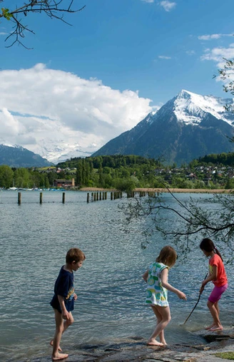 Sanft absteigend geht’s am etwas versteckten Strättligturm vorbei, wo einst die Edlen von Strättligen hausten. Jenseits der Simmentalstrasse steht man unvermittelt vor dem dunklen Schlund des Kanderdurchstichs. 1713 sollte die Kander damit zur Schuttablagerung im Thunersee gezwungen werden. Bereits ein Jahr später riss der wilde Fluss den gesprengten Stollen ein. Auf dem soliden Strättligsteg ans jenseitige Flussufer und hinauf nach Einigen. Ein Strässchen führt nun über einen aussichtsreichen Hügelrücken nach Riederen. Anschliessend wird der Rustwald auf Forstwegen und schmalen Pfaden durchschritten. Im Spiezmoos unterquert man Bahnlinie und Hauptstrasse und steigt zum bewaldeten Spiezberg hoch. Am Waldrand geniesst man nochmals einen herrlichen Ausblick über die Rebgärten zu Schloss und Schlosskirche von Spiez. Durch die Schlossanlage geht es auf einem Treppenweg hinunter zur Ländte in der Spiezbucht.