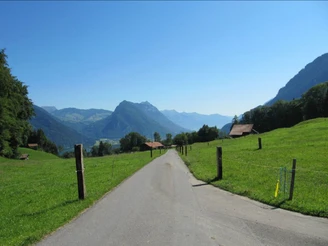 In der Flanke des Morgenberghorns wird auf einem schönen Höhenweg das Gebiet In de Wenge durchquert. Danach beginnt der Abstieg. Er führt zunächst steil zum Leissigbärgli hinunter, dann durch Wald und über Wiesen nach Leissigen.