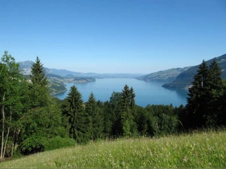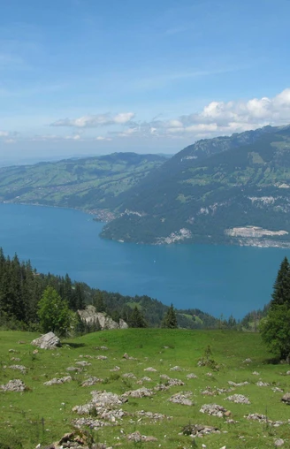 Grossartig ist die Aussicht von der Brunnialp. In der Tiefe schimmert in sattem Blau der Thunersee, darüber erstreckt sich der doppelte Felsrücken von Niederhorn und Sigriswiler Rothorn. Dichte Tannenwälder und offenes Weideland formen ein abwechslungsreiches landschaftliches Mosaik.