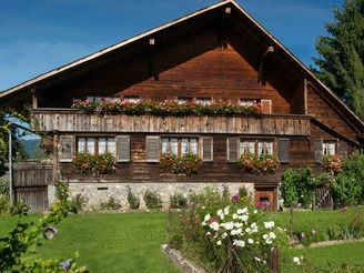 Alsbald schon nimmt die Gegend deutlich ländliche Züge an: Weite Grasflächen, einige Äcker, dazwischen dichter Wald und ausgedehnte Hecken prägen das Gesicht der Landschaft. Am Gehöft Nussbaummatt vorüber gelangt man zum Rosindlirain und von dort, in leichtem Aufstieg, zum Weiler Willerüti. Hier zweigt die Route rechtwinklig nach Süden ab. Der Blick auf das Aaretal, die wild gezackte Kette des Sigriswiler Rothorns und die eisgekrönten Berner Hochalpen ist zauberhaft. Nun folgt ein kleines, verträumtes Wäldchen, in dem sich die Wanderwege verzweigen. Hier hält man geradeaus, gelangt bald wieder auf offenes Gelände und erreicht an mehreren Einzelhöfen vorbei den Thieracher Ortsteil Wahlen.