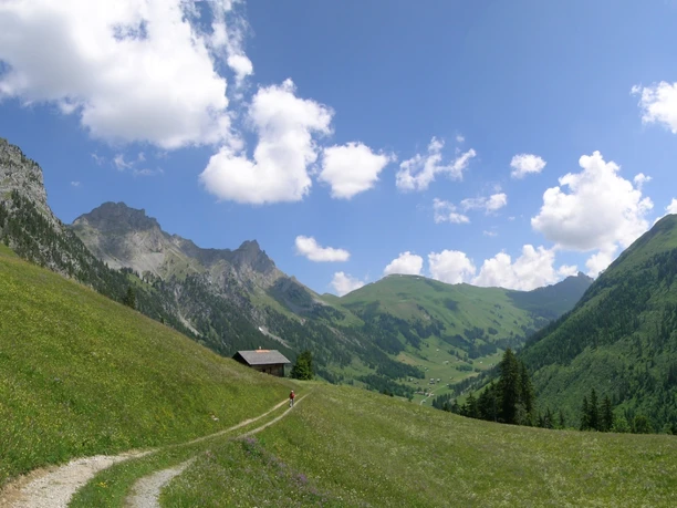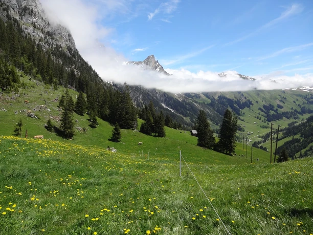 Nun gehts talwärts: Zunächst über duftende Wiesen und Weiden, danach auf einem Alpsträsschen, bald aber wieder auf einem schmalen Waldpfad. Vom Gandbodewald gelangt man dem Zälgbach entlang hinunter in den Dorfteil Grodey der Gemeinde St. Stephan und schliesslich zum Bahnhof St. Stephan.