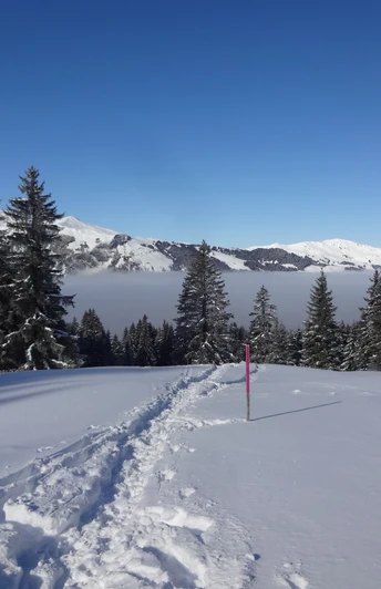 Von der Bushaltestelle Bühlberg startet die signalisierte Schneeschuhroute fast ebenen Wegs in nordöstlicher Richtung. Über offene Schneeflächen stapft man dem lichten Wald Richtung Schwandweidli entgegen. Man quert verschneite Bachläufe bahnt sich einen Weg durch schneeverhangene Tannen und überquert einsame Waldlichtungen. Nach dem Passieren der Schwandweidlihütte befindet man sich nahe des Wildschutzgebiets. Hier sollte man trotz einladendem jungfräulichen Pulverschnees auf der signalisierten Route bleiben und den Tiere ihren wichtigen Lebensraum lassen. Auf dem Rückweg Richtung Loosegg folgt man fast ebenen Wegs einem Sommerfahrweg. Kurz vor Loosegg zweigt man links ab und steigt durch halboffenes Gelände zum Bühlberg hoch.