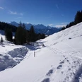 In entgegengesetzter Richtung zum Winterwanderweg führt die Schneeschuhroute erst wieder hinauf Richtung Oberburgfeld. Parallel zur Waldgrenze geht's anschliessend zur Chüematte hinüber. Bei schönem Wetter ist an Wochenenden hier das Chüematte-Beizli offen.