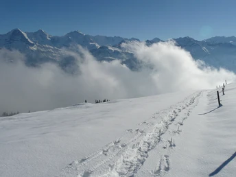 Von der Mittelstation Beatenberg Vorsass führt der verschneite Waldweghinauf Richtung Flösch. Nach einer kurzen Waldpartie folgt weit offenes Gelände, das einen wunderbaren Ausblick über den Thunersee erlaubt. Der Trail führt weiter durch eine unberührte und lichte alpine Waldlandschaft bis zur Alp Unterburgfeld. Die Alphütte vor prächtigem Panorama lädt zu einer Pause ein. Anschliessend steigt der Weg ein kurzes Stück über den Winterwanderweg hoch Richtung Oberburgfeld. Kurz vor den Alphütten schwenkt der Trail jedoch ostwärts in Richtung Chüematte ab. Der nun folgende Abschnitt führt wiederum durch lichten Wald und eine einzigartige Landschaft. Weiter geht es bis zur Alp Chüematte. Der Abstieg nach Beatenberg / Waldegg führt über den offiziellen Winterwanderweg.