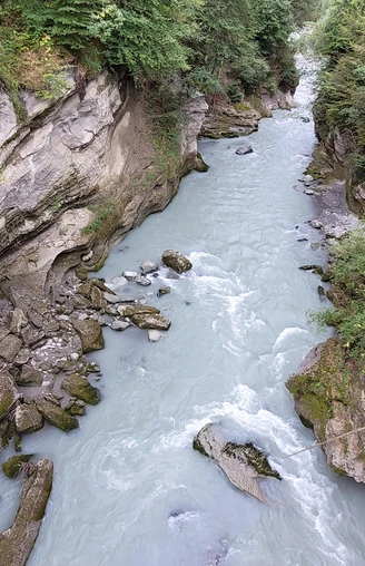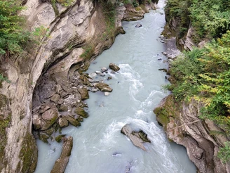 Die Wanderung führt am Seeufer des Thunersees entlang durch den Bonstettenpark. Durch das Dorf Gwatt wandert man steil bergauf bis man zum Burgunderweg gelangt. Hier bietet sich ein wunderbarer Ausblick auf Eiger, Mönch und Jungfrau, über den Thunersee und bis nach Thun. Den schmalen Pfad schmücken links und rechts Weiden und mächtige, alte Kastanienbäume. Auf dem Grat erscheint bald der imposante Pulverturm die "Strättligburg". Etwas abwärts erreicht man bald die Strasse und quert diese. Danach geht es kurz auf Treppenstufen steil bergab. Die Kander bahnt sich tief unten ihren Weg durch die Schlucht. Auf dem Strättligsteg blickt man tief nach unten.