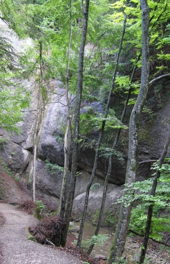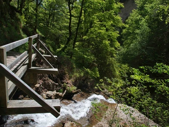 Von der Bushaltestelle Seematte ins Dorf Hünichbach aufsteigen. Oben im Dorf den Bach überschreiten und beim Alten Schulhaus wieder bachwärts in die Kühle der bewaldeten Cholereschlucht einschwenken. Der vorzüglich ausgebaute Wanderweg windet sich über Brücklein und Treppenstufen durch die Schlucht empor. Turmhoch ragen beidseitig des Weges die senkrechten Nagelfluhwände auf. Mitten in der Schlucht befindet sich bei einem mächtigen erratischen Block ein schöner Rastplatz. Im Zickzack führt der Weg nun hinauf zur Goldiwilstrasse, welcher 100 m nach rechts zu folgen ist. Nun, die Richtung beibehaltend, auf den bergwärts haltenden Fahrweg abschwenken. Nach Verlassen des Waldes gewinnt man, an einem Gehöft vorbeihaltend, rasch an Höhe. Rückwärtig weitet sich der Blick zu Niesen und zu den Berner Alpen. Voraus taucht die herrlich gelegene Häusergruppe um die Kirche von Goldiwil auf (nach Heiligenschwendi-Dörfli–Stierenegge–Hilterfingen 1h30). Goldiwil wurde 1913 in Thun eingemeindet, um der Stadt wachsenden Raum zu geben. Die sanfte Querung des oberen Choleregrabens gestattet herrliche Ausblicke ins untere Thunerseebecken, auf Belpberg, Gurnigel und Stockhornkette.