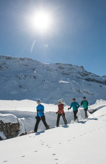 Skifahrer kennen die Engstligenalp als schneesicheres Skigebiet das bis weit in den Frühling hinein noch top Bedingungen bietet. Auf der Engstligenalp bei Adelboden lässt es sich jedoch auch gut Schneeschuhlaufen. Mit dem Engstligenalp Trail steht eine einfache, durchgehend signalisierte Route bereit. Der Trail startet direkt bei der Bergstation der Luftseilbahn und führt zuerst leicht abwärts zum Läger. Vorbei an den verschneiten Alphütten führt die Route über die immense Ebene der Engstligenalp. In weitem Bogen quert die Route das verschneite Schotterdelta des Wildstrubels. Je nach Schneehöhe kann man sich hier am Grosse Lägerstei, dem grössten Brocken, der einst vom Wildstrubel rollte, orientieren. Der Rückweg führt zurück zu den verschneiten Hütten des Lägers und über den Hinweg retour zur Luftseilbahn. Hier passiert man auch die beiden an der Route liegenden Restaurants mit ihren wunderbaren Sonnenterrassen.