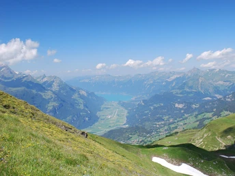 Wieso die Bezeichnung «Im Herzen der Schweiz»? Da die Aelggi-Alp, Mittelpunkt der Schweiz, nur einige Kilometer von Hasliberg entfernt liegt. Erst die Eröffnung der Bahnlinie über den Brünigpass 1888 und der Strasse zum Brünigpass im Jahr 1907 ermöglichten die Entwicklung zur heutigen Tourismusdestination. Die vier Dörfer Hohfluh, Wasserwendi, Goldern und Reuti erstrecken sich über neun Kilometer. Das Gemeindegebiet reicht von der Engstlenalp bis zum Brünigpass. Hier findet jedes Jahr am letzten Julisonntag der Brünigschwinget statt. Die Anreise mit der Bergbahn begeistert Gross und Klein. Bei der Bergstation Planplatten, auch als Alpen tower bekannt, lohnt sich ein Besuch auf der Terrasse um die Aussicht Richtung West zu geniessen. Der Blick schweift über den Brienzersee, die Ebene des Haslitals und zu schneebedeckten Berggipfeln. Die Route ist ab dem Startort mit dem Ziel Käserstatt signalisiert.