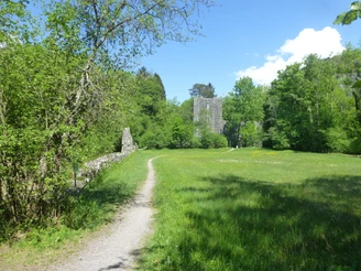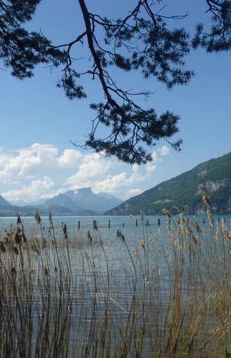 Rechts ist die Ruine Weissenau zu erkenne. Die Burg wurde im 13. Jahrhundert erbaut, um den Warenverkehr zu kontrollieren. Im16. Jahrhundert wurde sie aufgegeben und zerfiel danach. Wenig später bei einem Parkplatz in Weissenau biegt der Weg links ab und führt in das Naturschutzgebiet Weissenau. Mehrere Plätze ermöglichen Naturfreunden die Beobachtung der Vogelwelt. Der Pfad verläuft in Ufernähe, der Blick auf den Thunersee mit den umliegenden Bergen ist frei. Bald ist das Strandbad bei Neuhaus erreicht. Über den Parkplatz und durch eine Unterführung gelangt man zur Lombachbrücke und zur Lombachpromenade. Hier gilt die Wegweiseranschrift Unterseen. Das Rauschen des Bachs begleitet die Wanderer auf den nächsten zwei Kilometer bis St. Niklausen. Bei der gleichnamigen Bushaltestelle heisst es, am Fuss des Harders Richtung Interlaken Ost weiter zugehen. Erst nach dem der Friedhof passiert ist, schwenkt man Richtung Interlaken West ab und streift Untersee. Der einst strategisch wichtige Ort brannte in seiner Geschichte zwei Mal nieder und erhielt schon im 12. Jahrhundert das Stadtrecht. Kurzum ist das Ziel, der am Bahnhof Interlaken West erreicht.