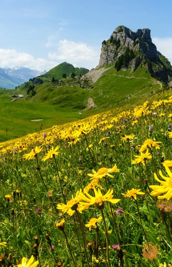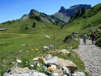 Bei der Endstation der Zahnradbahn auf der Schynigen Platte steht man direkt vor dem Eingang des Alpengartens. Der Ausgangswegweiser für die Wanderung liegt etwas zurück. Hier zweigt auch der knapp zweistündige Panorama-Rundweg ab, der bezüglich Aus- und Tiefblicken keine Wünsche offenl ässt. Doch schon hier zeigen sich Eiger, Mönch und Jungfrau in unvergleichlicher Majestät, und auch der Tiefblick in die beiden Lütschinentäler ist beeindruckend.