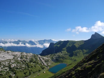 Der Abstieg über den Gassenboden an den Bachalpsee ist recht steil, erfolgt aber auf gut angelegtem breitem Weg. Der Blick über die dunkle Wasserfläche zu Wetterhorngruppe, Schreckhorn und Finsteraarhorn ist unvergleichlich und weitet sich auf der First noch beträchtlich, da jetzt auch die beiden Grindelwaldgletscher und der Eiger ins Gesichtsfeld treten.