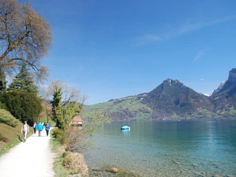 Die Rundwanderung um Spiez lässt sich dank guter Verkehrsanschlüsse an verschiedenen Stellen beginnen bzw. beenden. Ein idealer Ausgangspunkt ist die Schiffländte unterhalb des Schlosses. Wer statt auf dem Wasserweg mit dem Zug anreist, erreicht die Bucht vom Bahnhof her in einem viertelstündigen Spaziergang oder mit dem Bus. Am Freibad vorüber gelangt man zum Strandweg, einem idyllischen Uferweg, der direkt dem Thunersee entlang nach Faulensee führt. Von dort geht es auf Asphaltsträsschen aufwärts. Nach der Unterquerung von Bahnlinie und Autobahn erreicht man den Seeholzwald, den man, weiterhin ansteigend, auf Kieswegen durchquert. Am Waldrand rückt unvermittelt die stattliche Pyramide des Niesens ins Blickfeld. Geradezu alpinen Charme verströmt das Bauerndorf Hondrich, das Standort eines Ausbildungszentrums für Berglandwirtschaft und Hauswirtschaft ist. Bei schöner Aussicht ins Niedersimmental gelangt man über Weiden und durch Wälder nach Spiezwiler hinunter, durchquert den Ort auf Trottoirs und Quartiersträsschen und wandert oberhalb des Stauweihers nach Lattigen, wo sich die Route ostwärts wendet. Nach Durchquerung des Ortsteils Spiezmoos erreicht man den bewaldeten Spiezberg und gelangt, am ausgedehnten Rebberg vorüber, zum Schloss Spiez hinunter und zurück zum Ausgangspunkt, der Schiffländte in der Spiezer Bucht. Zum Spiezer Rundwanderweg ist ein Faltprospekt verfügbar, der auf dem Tourismusbüro beim Bahnhof bezogen oder von der Website spiez.ch heruntergeladen werden kann. Darin werden etliche Sehenswürdigkeiten am Weg, die unter Naturschutz bzw. unter Denkmalschutz stehen, näher vorgestellt.
