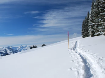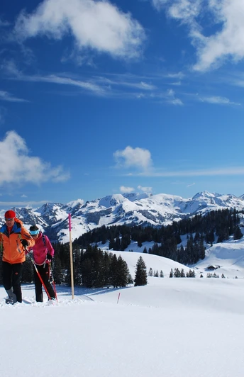 Der Nüjeberg Trail startet beim Berghotel im Sparenmoos. Die ersten 600 Meter folgt der Trail dem Winterwanderweg westwärts Richtung Hüsliberg. Nach einem tollen Aussichtspunkt schwenkt der Trail vom Wanderweg ab und führt sanft ansteigend bis zum höchsten Punkt des Hüslibergs. Die Aussicht ins Obersimmental und Saanenland sind hier schon wunderbar. Es wird jedoch noch besser. Der Trail führt anschliessend durch eine Senke hinüber zum Nüjeberg. Vorbei an der verschneiten Alp gelangt man hinauf zum Pkt. 1757. Hier erwartet einem wiederum eine geniale Aussicht. Es wird jedoch noch besser. Richtung Hundsrügg quert der Trail die Loipe und den Winterwanderweg. Anschlissend steigt der Trail auf den höchsten Hubel im Gebiet uf de Huble. Mehr Aussicht ist auf diesem Trail nicht möglich. Mittagflue, Stockhorn, Niderhorn, Spillgerten, Albrist, Wildstrubel, Wildhorn, Giferspitz, Rubli usw. reihen sich alle um uns auf.