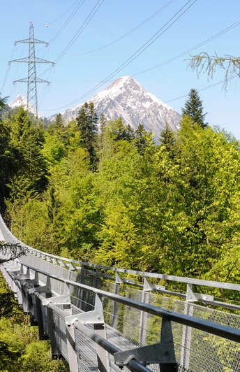 Bald tut sich nun die Sicht auf den Thunersee auf. Ab Hellbode wandern wir auf einer Alpstrasse am Tipicamp Wildspur vorbei bis Rossweid. Hier begeben wir uns wieder auf einen Wanderweg. Durch Wald, dann wieder über Alpweiden kommen wir bald zur Panoramabrücke Leissigen. Die 60 Meter hohe und 144 Meter lange Hängebrücke wurde 2012 im errichtet. Nach der Hängebrücke ist das Hotel Meielisalp bald erreicht. Eine Rast auf dessen Sonnenterrasse mit grossartiger Aussicht auf den Thunersee ist äusserst verlockend (der Sonnenuntergang von hier ist besonders schön). Von der Meielisalp gelangt man sanft abwärts steigend über die Alpweiden vom Stoffelberg nach Därligen.