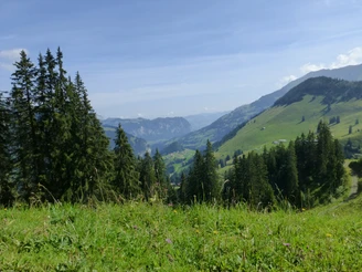Hinfahrt: Mit Bahn nach Oey – Diemtigen, mit Postauto bis Riedli, Talstation, mit Sesselbahn bis Nüegg