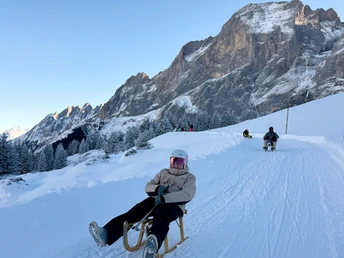 Lehn Dich zurück und geniesse die rund 30-minütige Fahrt mit den Traktoren im Spezialanhänger auf die Grosse Scheidegg.