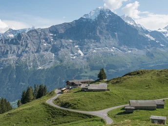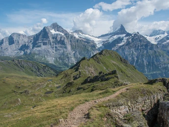Bei der Bergstation First kann wer möchte erstmal seine Höhenresistenz überprüfen, indem man den kurzen aber luftigen Gang über den Cliff Walk macht. Zumeist auf einer Schotterstrasse wandert man anschliessend zum Bachalpsee. Die rund 100 Höhenmeter Aufstieg bis zu dem wunderschön gelegenen Bergsee sind aufgrund der Distanz von rund 3 km kaum wahrzunehmen. Der Bachalpsee besteht aus zwei Seen, zwischen denen man auf den kleinen Wiesenstücken sich sehr gut bei einer Pause vermachen kann. Der Blick über den kleineren, vorderen der beiden Seen in Richtung der Berner Hochalpen mit dem markanten Schreckhorn verspricht ein wunderbares Fotosujet.