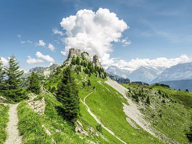 Beim Berghotel oberhalb der Bahnstation beginnt der Panoramaweg Schynige Platte in Richtung Aussichtspunkt Tuba. Dort wartet eine grossartige Sicht auf den Brienzer- und Thunersee sowie auf die Berner Alpen mit dem Dreigestirn Eiger, Mönch und Jungfrau. Weiter geht es auf dem gesicherten Grat, vorbei an Alpenrosenstauden und Kalkstein, zum Fuss des Oberberghorns. Der Gipfel des Felszahns kann über steile Leitern erklommen werden. Der Weg verläuft danach in Richtung Loucherhorn, das südwärts umgangen wird. Wieder geniesst man einen herrlichen Blick zu den Hochalpengipfeln. Durch ein Naturtor in einer Felsrippe, das Güwtürli, biegt man in die Felslandschaft des Güw ein. Kleine, ums Überleben kämpfende Fichten bilden die einzigen Farbtupfer in der Karstlandschaft. Auf der Egg wechselt man in die Flanke der Felstürme der Sägissa. Der Anstieg zum Sattel Männdlenen führt durch einen felsigen Talboden. Weiter geht es zur Fulegg. Die Route führt danach unter dem Faulhorn durch, wobei ein Abstecher zum Berghotel möglich ist. Danach folgt der Abstieg an den Bachalpsee. Der Blick über die dunkle Wasserfläche zum Wetterhorn, Schreckhorn und Finsteraarhorn ist unvergleichlich und weitet sich auf der First mit dem Grindelwaldgletscher und Eiger noch beträchtlich.