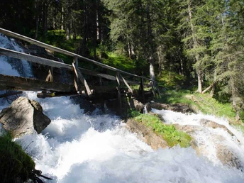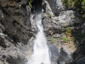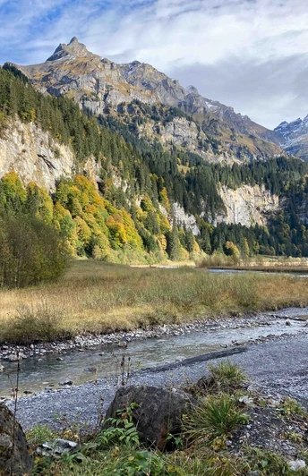 Von der Griesalp folgt man dem gelb markierten Wanderweg und quert direkt den Gamchibach. Weiter geht es dem tosenden Wasser entlang; links auf den Wanderweg, welcher talauswärts am hübsch gelegenen Hotel Waldrand-Pochtenalp vorbeiführt. In zahlreichen Kehren geht es abwärts. Man sollte dabei an der Griesschlucht keinesfalls den Abstecher über die Brücke zum Highlight der Tour versäumen: dem imposanten Pochtenfall. Das Wasser des Gamchibachs formte auch das Naturkunstwerk «Hexenkessel» – ein gewaltiges Strudelloch, das man beim Abstecher ebenso passiert. Wieder zurück auf dem Wanderweg erreicht man nur wenige Minuten später das Ende der Griesschlucht und das eine Ende des Tschingelsees. Das Gewässer, das heute eher weniger mit einem See zu tun hat, dafür aber mit Tümpeln und Wasserläufen lockt, zählt zu den Auengebieten von nationaler Bedeutung. Meist entlang der Strasse passiert man die Schwemmebene und überquert an deren Nordende das Gornerewasser. Der Talwanderweg führt nun dem Wasser entlang sanft absteigend ins Gebiet Fulbrunni. Unterwegs lohnt sich ein Abstecher ins Restaurant Alpenruh. Bei Loosplatte wechselt man die Bachseite und folgt dem Gewässer weiter bis zur Talstation der Sesselbahn Ramslauenen. Nach einem kurzen Anstieg erreicht man Kiental.