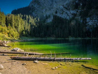 Von der Busendstation auf der Axalp geht es vorerst am Alpengasthof vorüber auf gut ausgebautem Wanderweg ostwärts. Die Steigung bleibt mässig. Rückwärts blickend ist das Augstmatthorn, der Harder und das dahinter aufragende Niederhorn zu erkennen. Die Baumreihen haben sich nach schweren Stürmen und Lawinenniedergängen merklich gelichtet. Aus den Baumstrünken haben Schüler der kantonalen Schule für Holzbildhauerei in Brienz vielfältige und originelle Skulpturen angefertigt. Kurz nach der Wegverzweigung in Färnigen quert man die sich vom Axalphorn herabziehende Bergrippe. Das in einer Senke liegende Hinterburgseeli ist erst zu sehen, wenn man fast unmittelbar an seinem Ufer steht. Wie ein Juwel leuchtet die blau-grüne Wasserfläche aus dem umstehenden Tannenkranz. Wuchtig erheben sich darüber die Felsbänder der Oltschiburg. Vom Seelein weg steigt der Weg wieder sanft an zum Übergang auf der Alp Hinterburg. Im Abstieg zu den Hütten Uf der Flue fesselt der Tiefblick ins untere Haslital, das vom Silberband der Aare durchzogen wird. Sehr steil ist der anschliessende Aufstieg auf schmalem Pfad durch die Flanke der Oltschiburg. Danach gehts in leichtem Auf und Ab zu den Hütten im Urserli (nach Tschingel– Chüemad–Axalp 2h45; nur für trittsichere, schwindelfreie Berggänger geeignet!). Unterwegs prachtvolle Aussicht zum Brienzersee. Vorsicht ist auf dem sich zusehends verengenden, steilen Felswänden entlang führenden Pfad zum Chruttmettli geboten, von wo ein breiter Waldweg nach Färnigen hinunter und zum Ausgangspunkt auf der Axalp zurück führt.