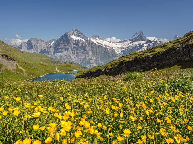 Vom Sattel am Westende des Ritzengrätlis geniesst man unvermittelt eine ganz andere Aussicht: In der Tiefe glänzt der Bachalpsee, und mit jedem Schritt Richtung First wird der Blick offener zu den Grindelwaldner Bergen, zu Finsteraarhorn und Fiescherhörnern und zu den vorgelagerten Gletschern.