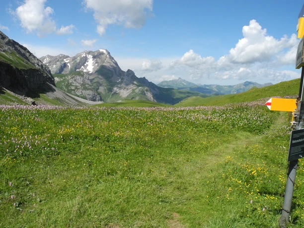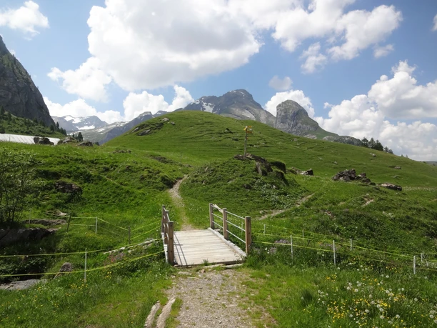 Depuis l'arrêt de car postal Legerlibrügg près du célèbre lac de Lauenen, suivre le chemin de randonnée vers l'aval jusqu'à Vorsass. Le sentier monte ensuite plus fortement et serpente en zigzag à travers les bandes rocheuses de Holzersflue jusqu'à l'alpe Chüetungel (via Burgbüel jusqu'au Stigelschafberg, point 2300, 1h30 ; précaution dans les bandes rocheuses du Stigle !). Par la pente escarpée de Holzersflue, on monte ensuite généralement hors sentier vers la cabane puis en grand arc à travers la vaste alpe Stieretungel. Par un chemin presque plat, en contournant une tourbière prononcée, on atteint le col de Tungel (via Stigelberg vers Pöschenried/Färiche 2h). Un mur de pierres marque ici la frontière entre les districts administratifs de Saanen et d'Obersimmental. Les habitants de Lenk désignent ce col sous le nom de «Stigellegi». La paroi du Niesenhorn, haute de 700 m, s’élève majestueusement. En direction directe de celle-ci, on entre dans la bande la plus basse des Stigle. Le chemin est taillé dans la roche et sécurisé par des câbles. La prudence reste de mise ! En zigzag, on monte au Stigelschafberg. Magnifiques fleurs dans les débris rocheux et sur les rochers le long du chemin. Par une cuvette rocheuse, on atteint le point culminant de la randonnée à 2381 m (45 min jusqu'à la cabane Wildhorn SAC). Le lac Iffig, bien visible et situé environ 300 m plus bas, est ensuite rejoint en descendant à travers des pâturages de moutons, marmottes et bovins. Peu après la fin du lac, le chemin se sépare. La variante la plus agréable passe près d'un étang, descend par la crête panoramique Egge vers le Groppi et suit un chemin d'alpage dans le fond de la vallée jusqu'à la chaleureuse Iffigenalp.