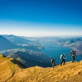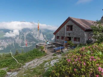 Bis P.1817 geht es auf gleichem Wege zurück, von wo wir uns auf den weiss-blau-weiss markierten Felsenpfad begeben. Die Schlüsselstelle wird bereits nach 5 min erreicht, so dass man Gelegenheit hat, sich die Stelle erst einmal „anzuschauen“, wenn man sich der Begehung unsicher ist. Über eine kurze Leiter und eine exponierte Querung mit Drahtseilsicherung wird der Felsgürtel unterhalb der Fisialp umgangen. Gute 20 min später sind wir nach der Kreuzung P.1804 wieder auf einem weiss-rot-weissen Wanderweg unterwegs. Auf diesem ist bald die oberhalb der Baumgrenze gelegene Fisialp erreicht. Über Alpwiesen steigen wir bergauf bis zur Wegkreuzung und der Schutzhütte Fisi Schafberg (P.2090). Mit kaum noch Steigung geht es das letzte Stück zur Jegertosse, anfangs durch Lawinenverbauungen und dann über Wiesengelände. Die Jegertosse ist zwar nur eine vorgelagerte Graskuppe des Innere Fisistock, doch die Aussicht auf die vergletscherte Flanke des Balmhorn und die umliegenden Täler ist schlicht überwältigend. Und das flache Wiesenplateau lädt dazu ein, die Beine für eine Weile auszustrecken bevor es in den langen Abstieg geht.