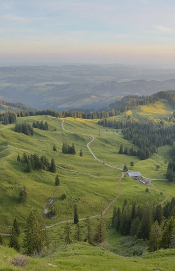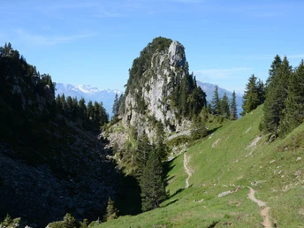 Von der Bushaltestelle Säge folgen wir der Beschilderung in Richtung Alp Obermatte, sanft ansteigend teils auf Alpstrassen, teils auf Wanderwegen. Bei der Alphütte geht es rechts, nach knapp 200 m auf einer Fahrstrasse weiter. Danach nehmen wir links über die Zettenalpegg bis auf den Sigriswilergrat den Wanderweg. Rechts haltend queren wir die Nordostflanke des Sigriswiler Rothorns und weiter bis auf die Südseite des Rothorns. Wo man auf den Wanderweg trifft, welcher von Oberbärgli heraufkommt, geht es nach rechts. Nach einer kurzen Querung nach Norden erreichen wir zum Schluss mit ein wenig Kraxelei das kleine Gipfelplateau des Rothorns mit seiner grossen Aussicht über den Thunersee hinweg zu den Berner Hochalpen. Auf identischem Weg zurück zur namenlosen Wegkreuzung geht es anschliessend südwärts über den Bergrücken hinab bis zur Verzweigung P.1812 kurz nach der Alphütte Oberbärgli. Wir halten uns rechts und treffen kurz nach dem namenlosen Felsturm auf die Wegkreuzung Bärglichäle bei P.1725. Wieder rechts haltend steigen wir weiter ab und treffen – die Alp Bodmi passierend – bei der Alp Stampf auf den Aufstiegsweg und kurz später den Ausgangspunkt Säge.