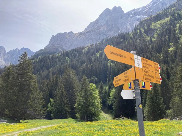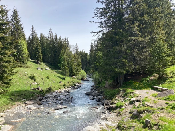 Depuis l'arrêt de car postal Chaltenbrunnen, court trajet en direction de la vallée, puis franchissement du Rychenbach et large chemin alpin à travers pâturages et forêt jusqu'aux chalets d'Undere Stafel. En montant régulièrement, on gagne rapidement de l'altitude et on atteint le chalet à Obere Stafel sur l'alpage de Chaltenbrunnen. Le détour vers le bord de la tourbière de Chaltenbrunnen au point 1817 (30 min) se fait sur le chemin vers Wandelalp. La tourbière plantée de pins et de mélèzes est un régal pour tout amoureux de la nature. Veuillez absolument emprunter le même chemin retour et, au-dessus du chalet d'Obere Stafel, suivre les marques colorées pour monter au pied est du rocher Tschingel. La vue sur les dents rocheuses des Engelhörner qui s'élèvent de l'autre côté de la vallée est splendide : un eldorado pour les grimpeurs, connu bien au-delà des frontières suisses. Le sentier serpente très raide entre les rochers jusqu'à Chrüterenläger. Après le chalet, commence le magnifique chemin en altitude via Grindelschärm (descente vers Broch 1h45 ; vers Gschwantenmad 1h40) vers Grindelfeld. Le long de la lisière des éboulis, on traverse entre des bandes rocheuses, parfois sans sentier mais sans grandes différences d'altitude, en franchissant des ruisseaux de montagne, jusqu'à la cuvette alpine de Breitenboden, qui porte bien son nom. Devant se trouvent Wildgärst et Schwarzhorn, au-delà de la vallée les parois découpées du Wellhorn et du Wetterhorn. Aux chalets dans la partie supérieure de Breitenboden commence la descente le long du Pfannibach vers le fond de vallée de la Schwarzwaldalp. À Broch, deux variantes presque simultanées sont proposées pour le retour. Le chemin passant devant l'hôtel Rosenlaui permet une visite des impressionnantes gorges glaciaires (boucle de 45 min, droit d'entrée). En dehors de la route, un nouveau sentier passe par Gschwantenmad pour revenir à Chaltenbrunnen.