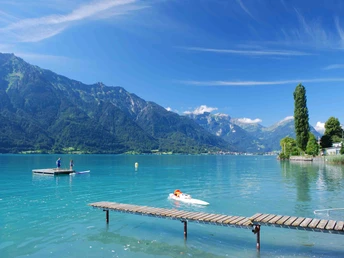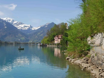 Das Dorf Niederried verlässt man auf dem Uferweg in Richtung Westen, der Signalisation Interlaken folgend. Vorbei am lauschigen Seebad gelangt man wenig später zum schönen Brätliplatz Entenstein. Nach einer Waldpassage steigt der Uferweg leicht an, quert die Bahn und endet kurz vor Ringgenberg an der Hauptstrasse. Dieser folgt man 300 Meter bis Ringgenberg / Säge. Das Zentrum dieses kleinen Ortsteils bildet ein Spielplatz, der von den Bögen des Eisenbahnviadukts umrahmt wird. Nach Unterquerung des Viadukts wird die Wanderung über den Büeliweg und durch eine Waldpassage fortgesetzt. Es folgt ein kurzer Abstieg hinunter zum See, anschliessend eine Uferwegpassage – mit schönen Verweilmöglichkeiten – bis zur Schiffstation Ringgenberg. Von dort verläuft die Wanderung über den als Katzenpfad bezeichneten Weg bis Goldswil. Unterwegs fällt die Burgruine ins Auge, das Wahrzeichen des Dorfes Ringgenberg. 52 Treppenstufen führen zum Aussichtsturm, der einen prächtigen Ausblick auf den See und die umliegenden Berge bietet. In Goldswil angekommen, ist man am unteren Ende des Brienzersees mit dem Ausfluss der Aare angelangt. Kurz vor der Eisenbahnbrücke sind in der Ferne die Berggipfel der Jungfrau erkennbar. Dem Aarekanal entlang geht es an der Talstation der Harderbahn und dem Platz Haberdarre vorbei. Auf Letzterem wurden im Mittelalter Getreide wie Hafer (Haber) getrocknet und Tiere geschlachtet. Ausserdem legten am Umschlagplatz einst Schiffe und Flösse für den Güterverkehr zwischen dem Brienzer- und Thunersee an. Ein kurzes Stück geht es noch der Aare entlang, bis man diese quert und am Bahnhof Interlaken West angelangt.