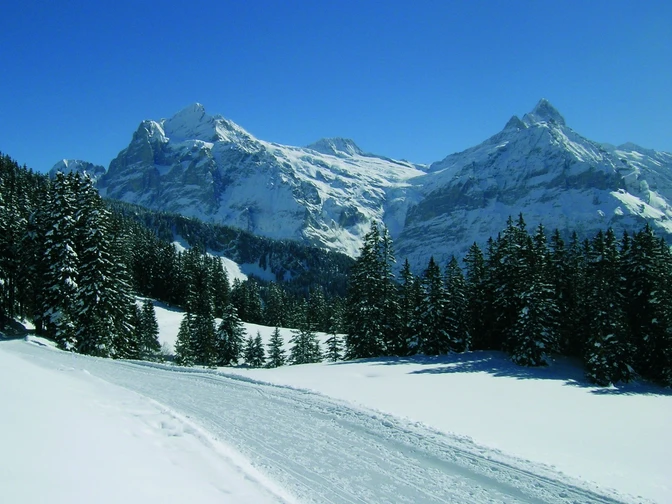 Der weitere Abstieg erfolgt mehrheitlich im Wald, auf Nodhalten auch wieder über verschneite Alpweiden. Beim Räckholtertor trennen sich Wanderer und Schlittler. Wer (sofern genügend Schnee liegt) bis Grindelwald hinunter fahren möchte, hält rechts und gelangt so direkt zur Chrisegg (Pkt.1520; siehe Route 5a). Wer zu Fuss unterwegs ist, behält dagegen die Höhe bei und gelangt durch lockeren Wald nach Niderbaach und von dort weiter zur Gondelbahn-Station Bort.