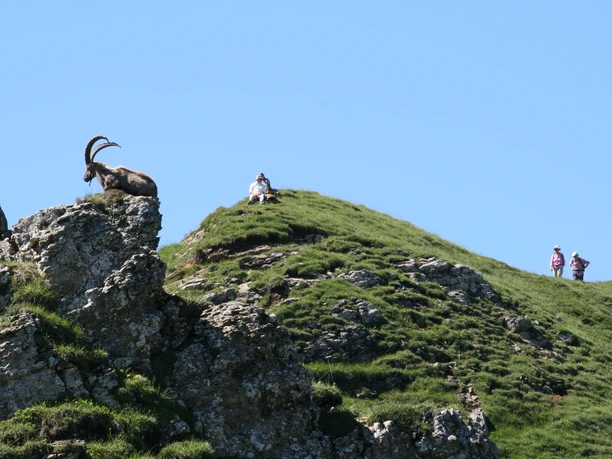 Il est recommandé de marcher d'abord vers l'ouest le long de la maison de montagne jusqu'à la fin de la crête, car de là, on peut admirer une vue grandiose sur le lac de Thoune, les villages environnants jusqu'au Jura. Par des alpages, on arrive au Bugfeldstand, le point le plus haut de la randonnée. Les chanceux aperçoivent un aigle ou un gypaète barbu en vol de repérage ou rencontrent des chamois. De Burgfeldstand au Gemmenalphorn s'étend la zone des bouquetins et des tétras des neiges. Les amateurs de fleurs trouveront ici de nombreuses fleurs de montagne. Un point de vue particulièrement beau se trouve au Gemmenalphorn, où la vue vers l'est est dégagée sur les Sept Juments, le Hohgant et toute la région de Seefeld. Suit un chemin raide qui descend du Gemmenalphorn via Laubenegg vers Seefeld Oberberg, en passant par une région karstique, entre les falaises jusqu'à la vallée de Justistal. À gauche s'élève le Güggisgrat et à droite le Sigriswilergrat monte en hauteur. On arrive au Hinterstberg dans la vallée de Justistal, où une pause est possible dans un chalet d'alpage. Après accord avec le berger, il est possible d'observer la fabrication du fromage. Fromage, beurre et autres produits laitiers de cet alpage sont achetables sur demande. La vallée de Justistal est peuplée de bétail paissant et de 150 à 200 cerfs. À partir de la mi-août, on entend les brames des cerfs pendant la période du rut. La majeure partie du chemin longe le ruisseau à travers les alpages jusqu'à Grön. De là, on marche vers Beatenberg en suivant la route goudronnée. La vue sur le lac est magnifique, elle s'étend de Faulensee à Thoune.