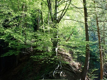 Le chemin commence par une descente. Bientôt on entend les oiseaux locaux chanter. Le regard se pose sur l'impressionnante Nagelfluh de la Tschingelfluh. Sur une colonne, on trouve des infos sur la forêt et le bois, à côté se trouve un endroit de repos. Le chemin continue sur un pont avec une vue à couper le souffle dans la gorge profonde jusqu'au lit du ruisseau avec ses grosses pierres, les blocs erratiques. En petites courbes, le chemin forestier monte légèrement. Un banc invite à une pause en pleine nature. En continuant, on suit une petite vallée, le « fischtere Gräbli ». Cette zone est particulièrement attrayante en mai, lorsque le tapis vert et blanc d'ail des ours couvre le sol. En direction d'Aeschlen, on traverse un pont. La formation rocheuse très intéressante de Nagelfluh composée de pierres arrondies (granit, gneiss, calcaire, etc.) se voit ici de très près. En suivant le panneau indicateur Aeschlen, on monte, quitte la forêt et atteint près du pont panoramique l'Hôtel Panorama Aeschlen.