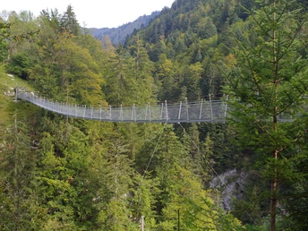Nous pénétrons maintenant de plus en plus profondément dans la gorge ; la nature et le paysage deviennent plus dramatiques. Nous tombons soudainement sur les ruines restaurées en 2014 et 2015 des thermes arrière et restons émerveillés par le courage des entrepreneurs qui y ont exploité un hôtel thermal il y a 150 ans. Sur un petit pont suspendu, nous traversons le Morgetenbach. Par plusieurs escaliers et un chemin sécurisé, nous arrivons à Leiternweide et traversons la gorge du Morgetenbach sur l'imposant pont suspendu. Et encore une fois, nous sommes émerveillés : vers 1850, la vallée de Bunschental était habitée toute l'année par 60 personnes. Et le chemin que nous avons parcouru sur cette installation sécurisée servait, avec seulement des échelles en bois branlantes, aux enfants de trajet scolaire difficile et pas sans danger vers la vallée.