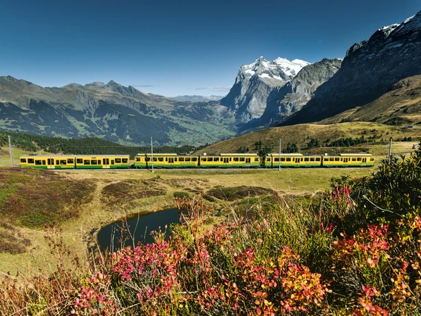 Depuis la gare d'Interlaken Ost, nous atteignons Wengen en 44 minutes. Avec le train bleu-jaune de la Berner Oberland Bahn (BOB), on se rend à Lauterbrunnen. Important : il faut être dans la partie avant du train, car il se divise à Zweilütschinen. Ceux qui sont à l'arrière font un détour par Grindelwald. À Lauterbrunnen, nous changeons pour le train jaune-vert de la Wengernalp Bahn (WAB). Il nous emmène en 12 minutes à Wengen.